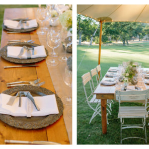 Our hand-crafted wood Farm Tables are made in-house and measure 8’x46″ seating up to 12 guests. Designed to be used bare or with a runner, these tables are perfect for the wine country wedding, family style meal, or coast-side dinner. We love them used as buffets, escort card tables, or for guest book signing. The tables have pine-plank tops stained to compliment both light and dark wood accents and their versatility continues to amaze us – fitting in both rustic and formal settings.